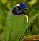 Mide de 20 a 25 cm. El plumaje de la parte dorsal de sus alas es verde oscuro. Su vientre y plumas de las patas y rabadilla son color amarillo. Tiene un parche en la garganta color negro al igual que el resto de su cabeza con excepción de una corona de color azul, unas marcas en los cachetes y unas "cejas" del mismo color azul.
