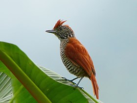 | Un pájaro tímido típicamente encontrado en matorrales y bordes de bosque. Al igual que otros batarás, tiene pico robusto con punta ganchuda. El macho tiene todo el cuerpo barrado en blanco y negro, muy similar a Barred Antshrike pero con la corona barrada (no sólidamente oscura). La hembra tiene la gorra y las partes superiores rojizas y es completamente barrada en blanco y negro abajo. Muy a menudo visto en parejas moviéndose sigilosamente a través de la vegetación densa; puede ser difícil obtener una vista clara. Restringido al oeste de Colombia. Escucha por su canto en aceleración, similar a Barred Antshrike pero con un final menos explosivo. |