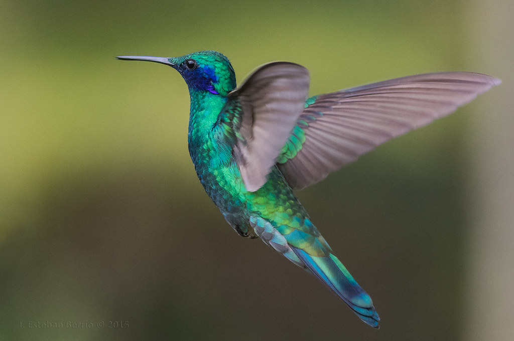 | DESCRIPCIÓN : Es un colibrí grande de color verde brillante, que mide entre 10 y 12 centímetros de largo. Su pico es largo, robusto y casi recto; en el pecho tiene las plumas bordeadas de un verde intenso y la parte media del vientre y la nuca son de un azul violáceo; las plumas laterales son largas de un color azul metálico y la cola es verde azulada con una banda azul oscura. Se caracteriza por que se resalta una oreja violeta brillante. | |